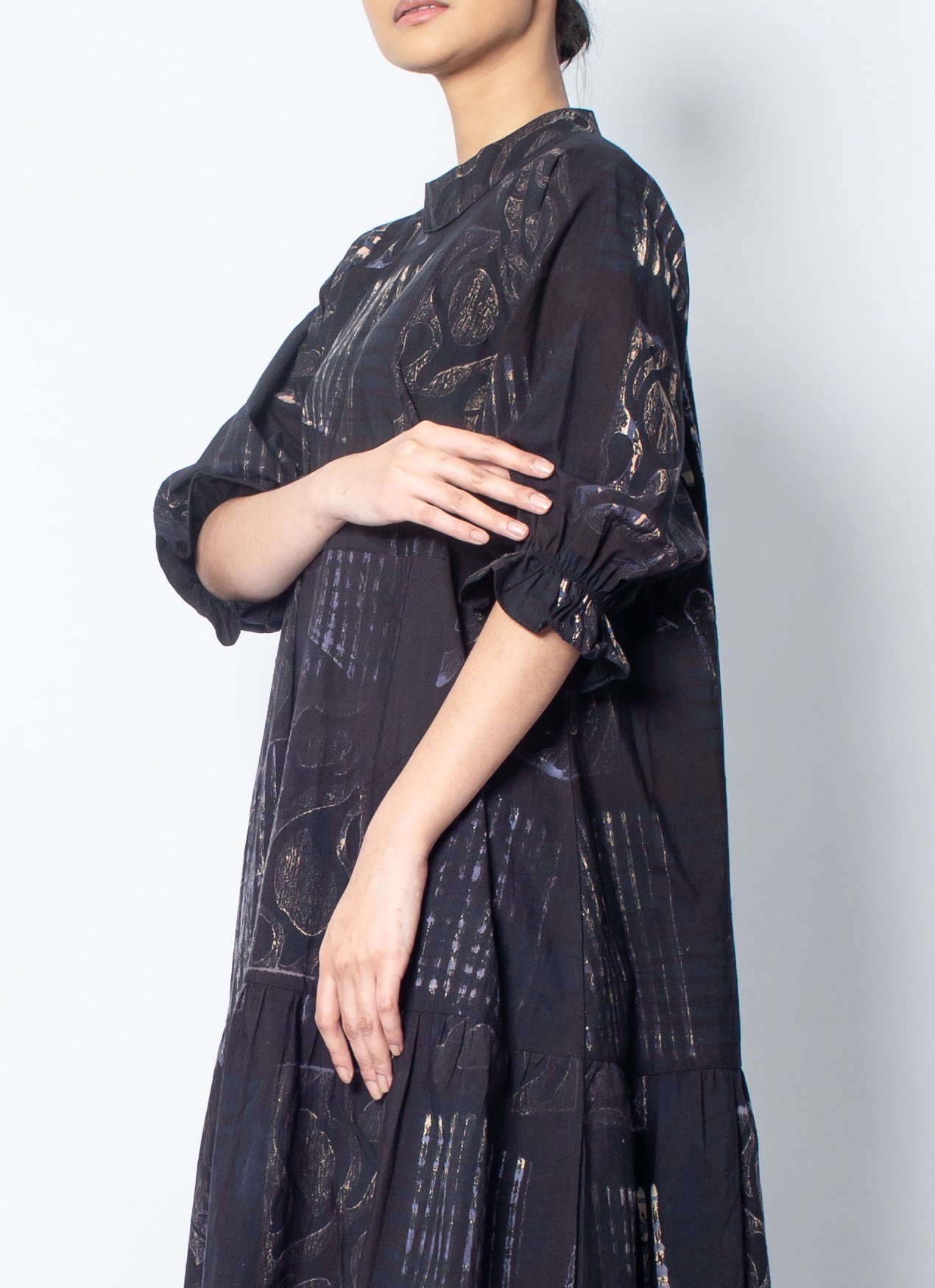 Long dress with puffy sleeves and round neckline. Falls to your calves. Proudly Made from Batik Lukis Pekalongan. Wear yours with leather sandals.