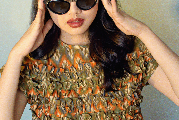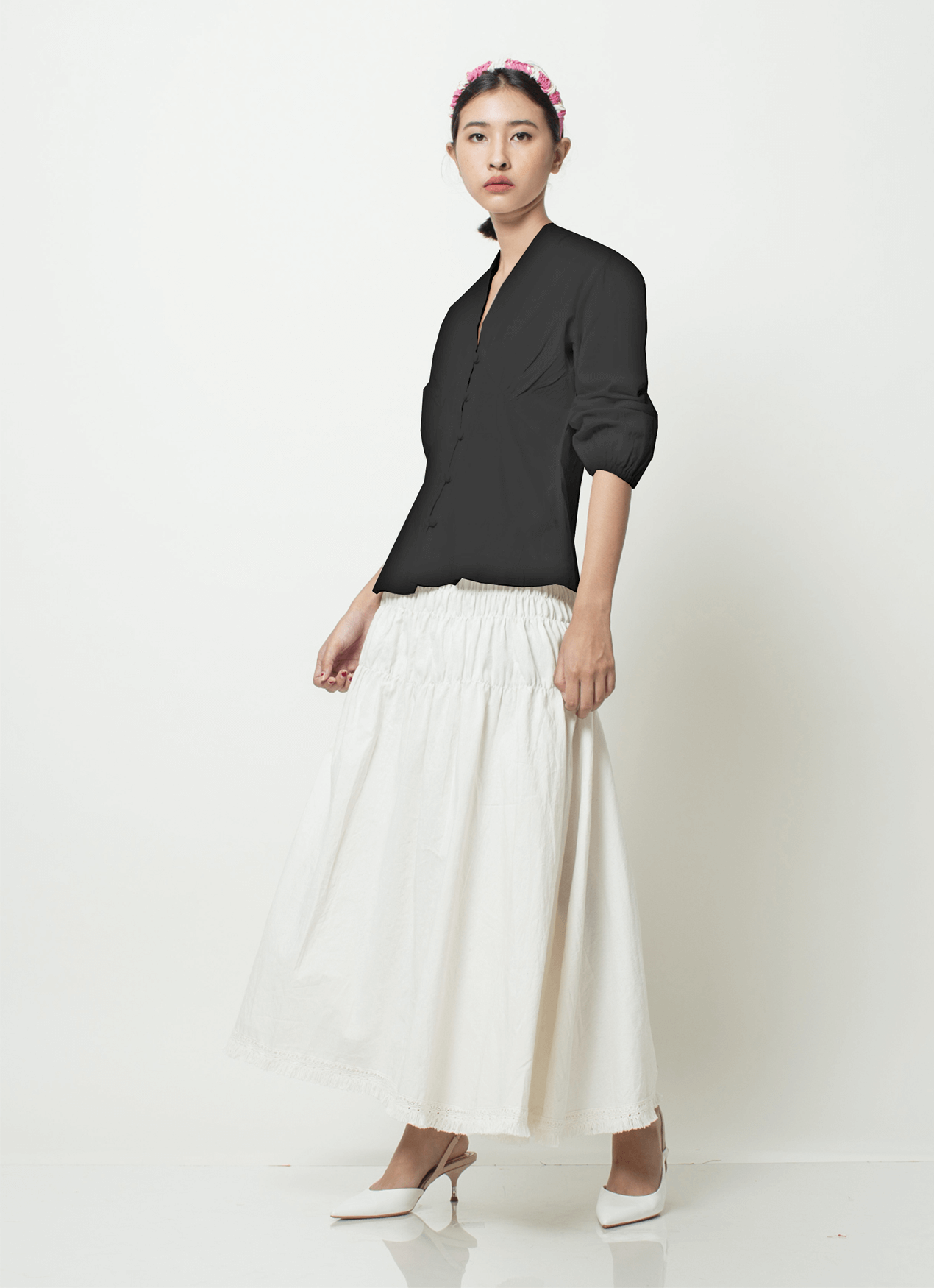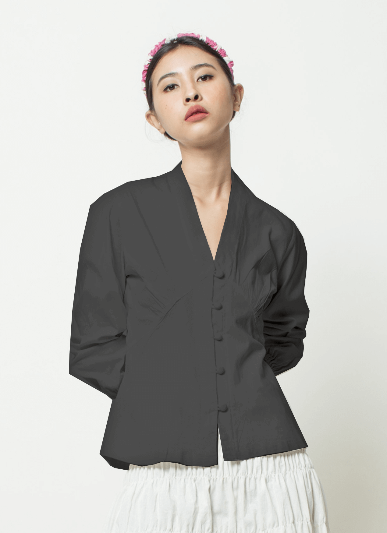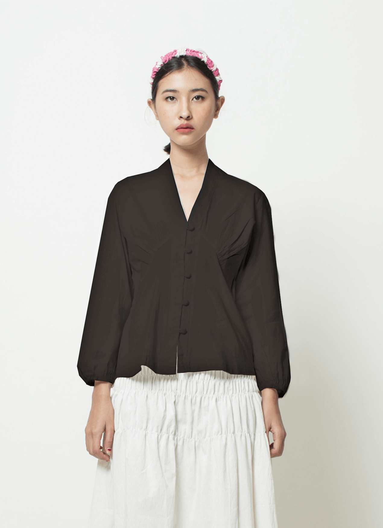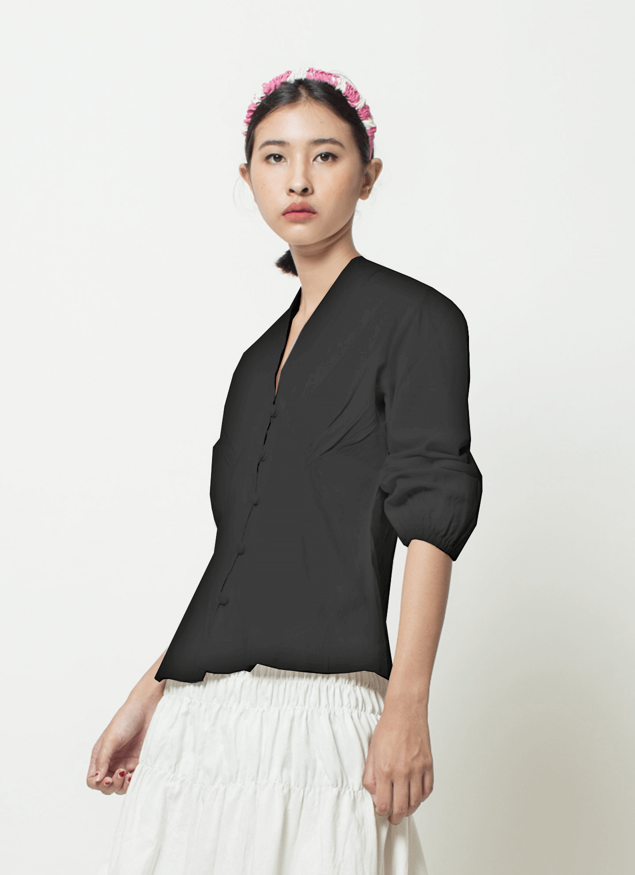 V-neckline tenun top with long sleeves and cheongsam buttons. Full rubber on both sleeves, so if you want to wear it 7/8, it gives a chic puff accent.