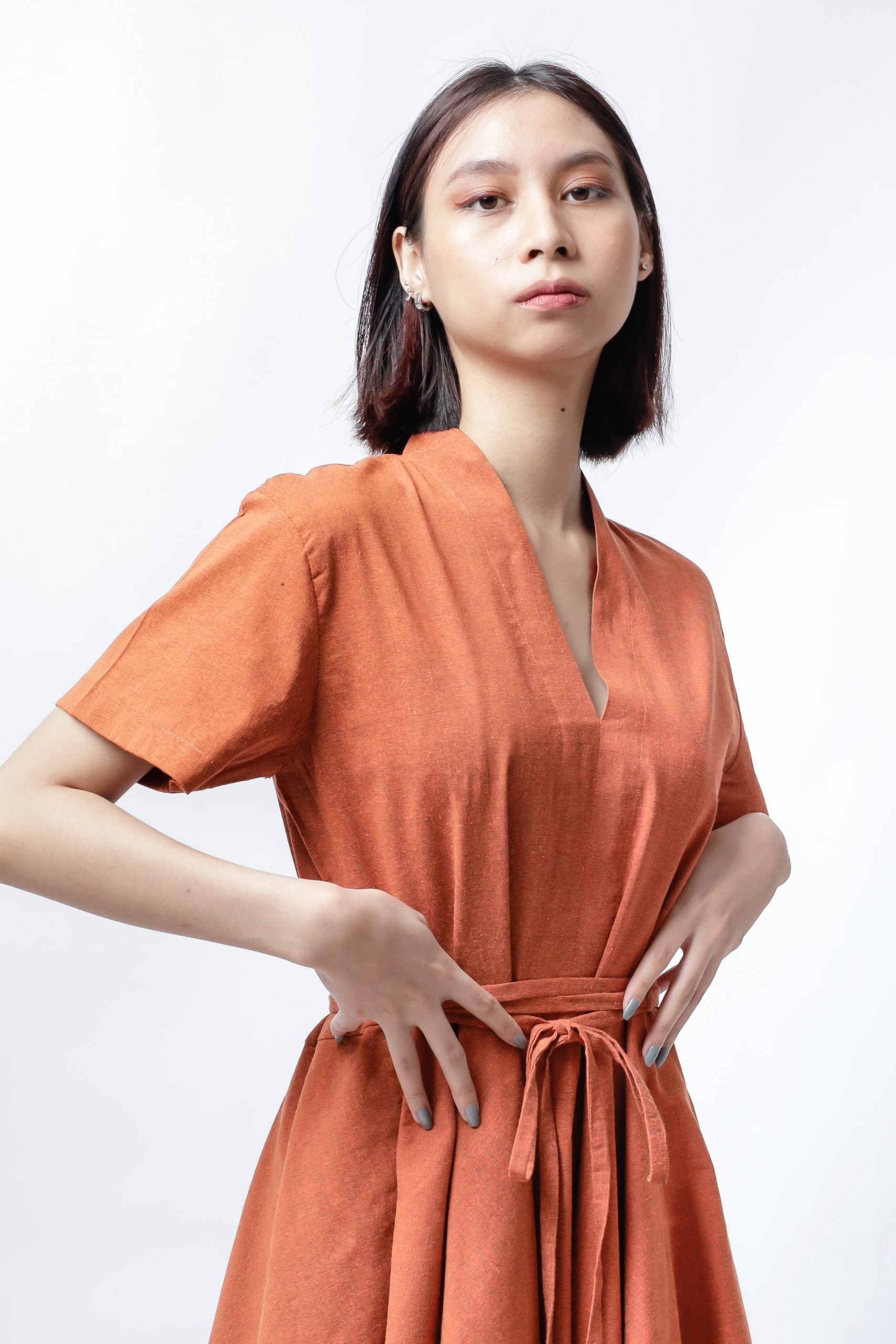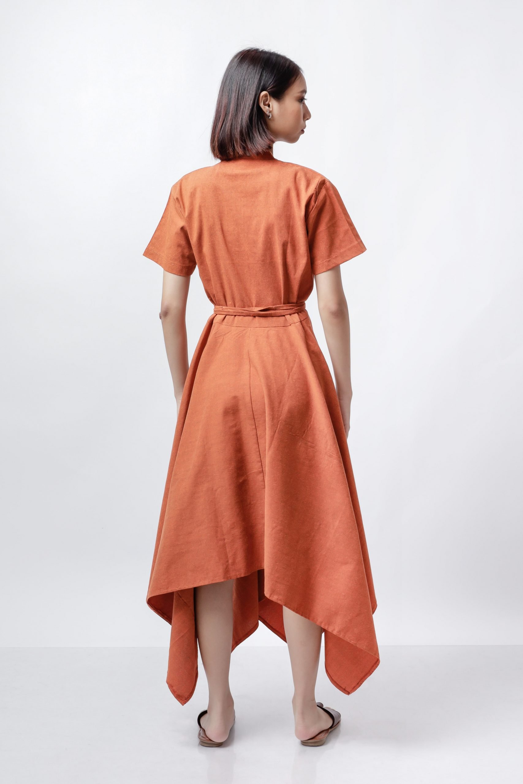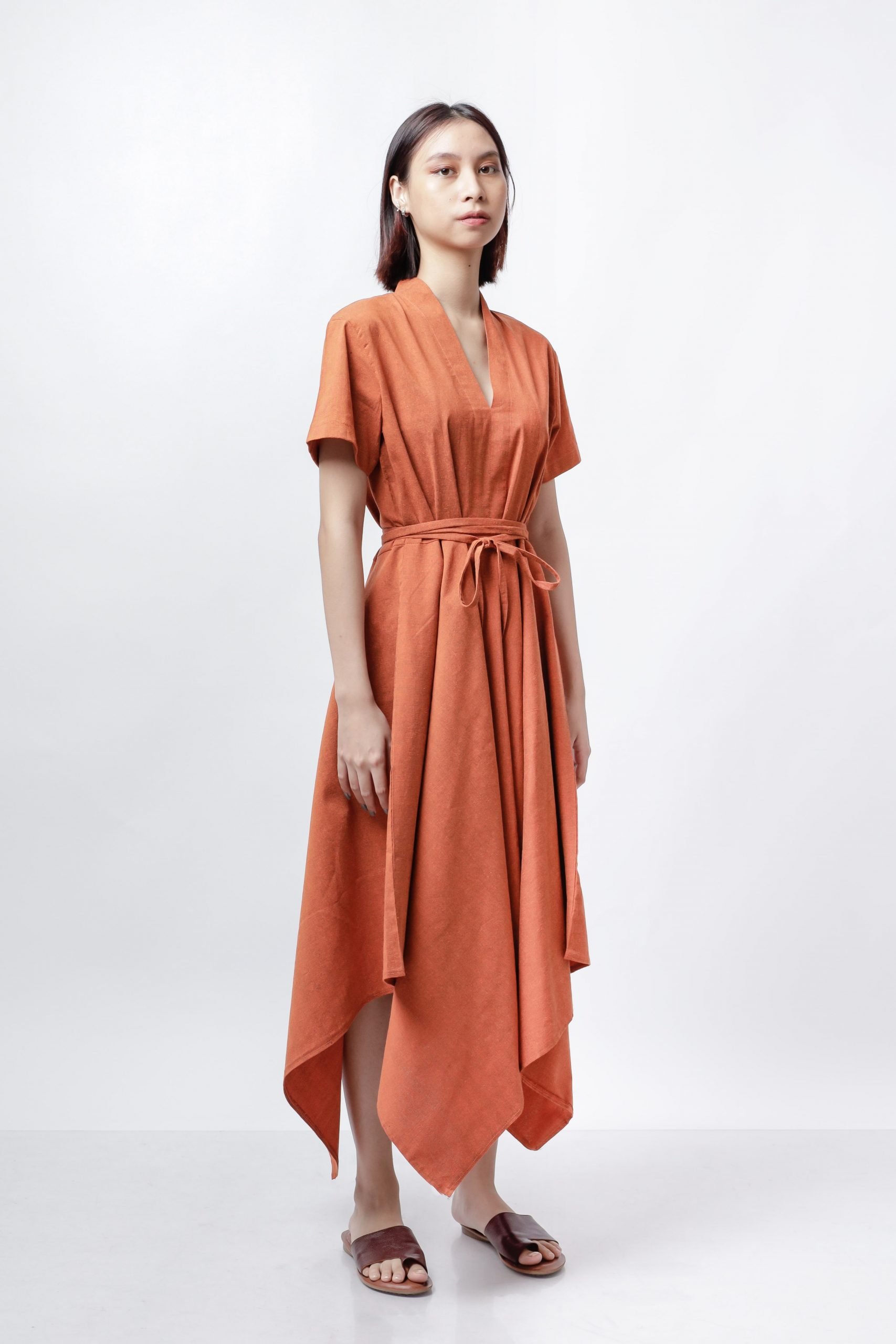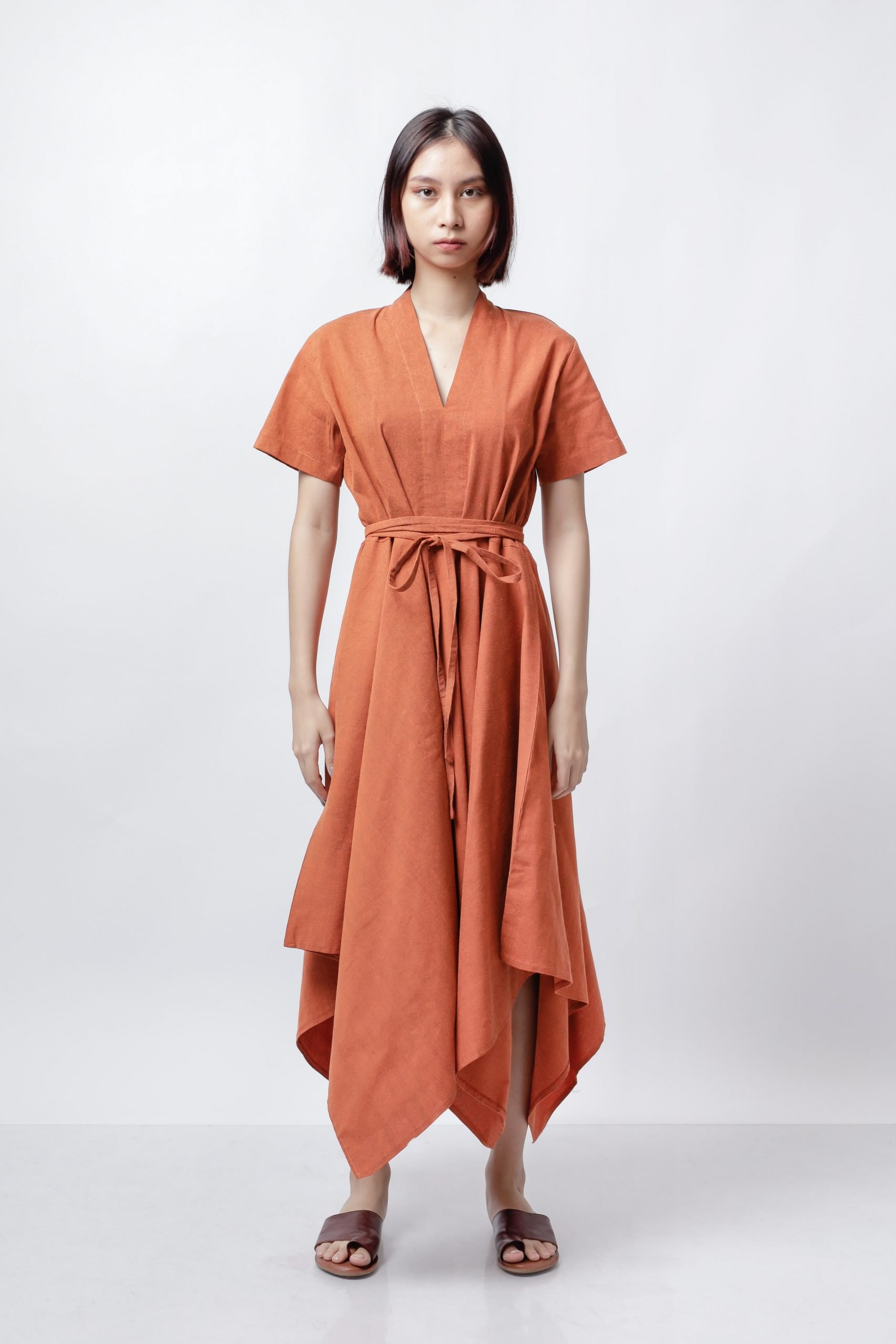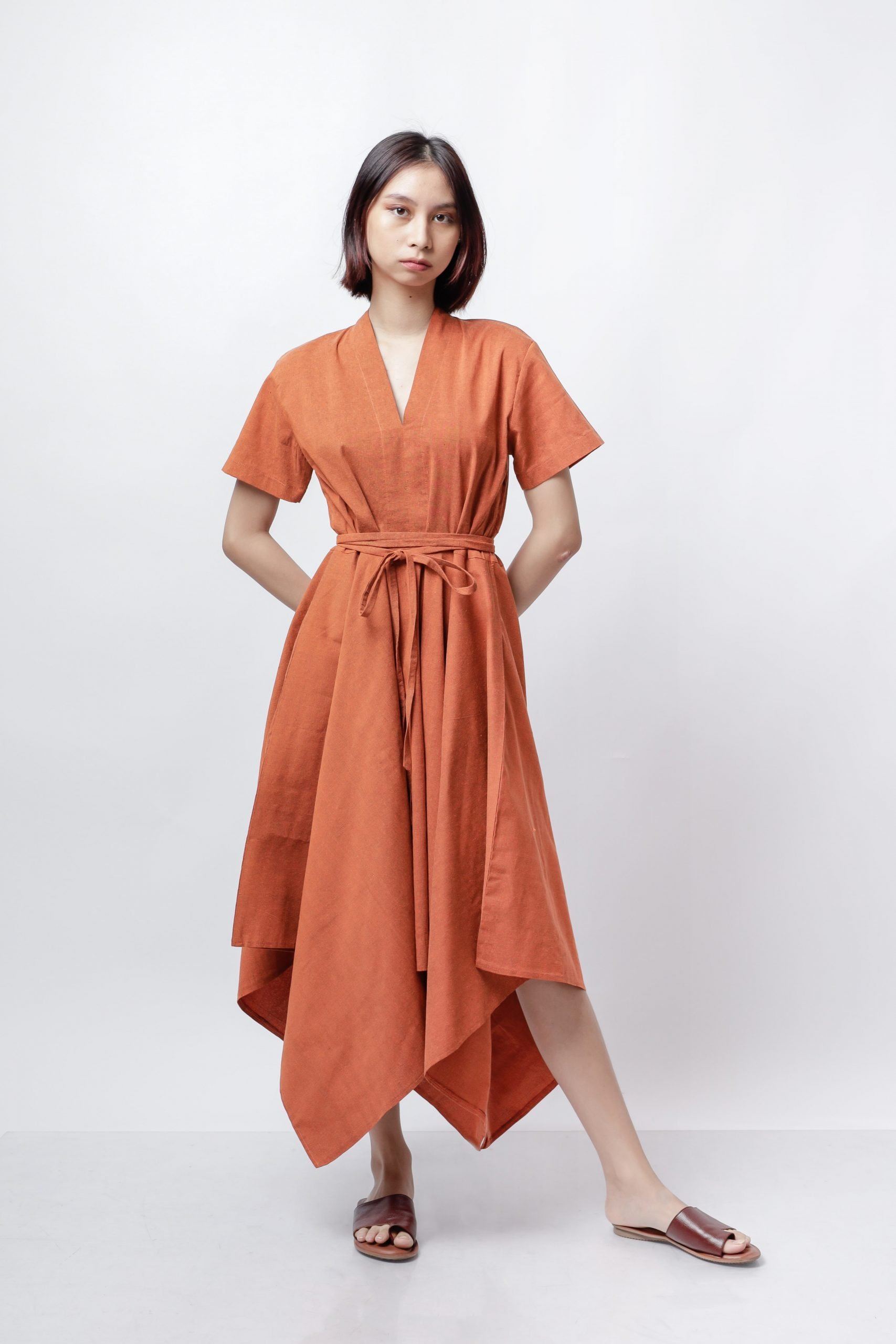 “Asymmetrical dress with easy to swing silhouette. V-neckline and short sleeves. Made from Jepara’s tenun. Wear yours from day to night comfortably..”