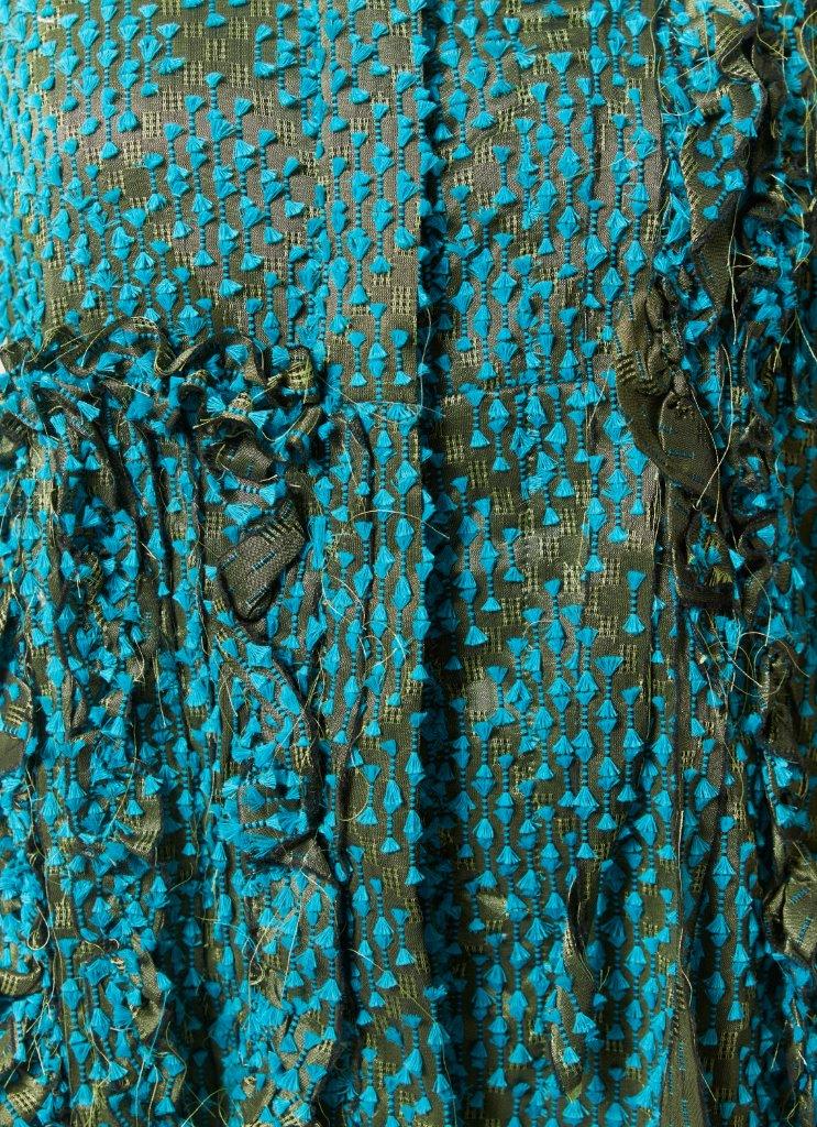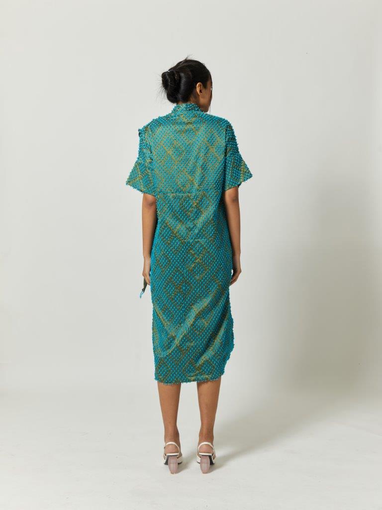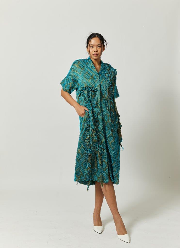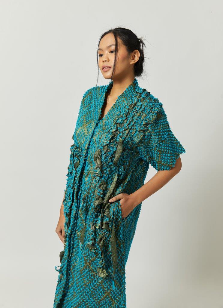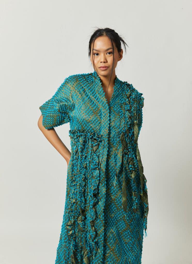 “Mid dress with v-neckline and short sleeves. Each piece is a celebration of cultural heritage highlighting zero waste pattern, utilizing every small scrap of fabric waste in its production, made in limited quantities with expertly handcrafted detailing. This dress is crafted from Jepara’s tenun baron.”