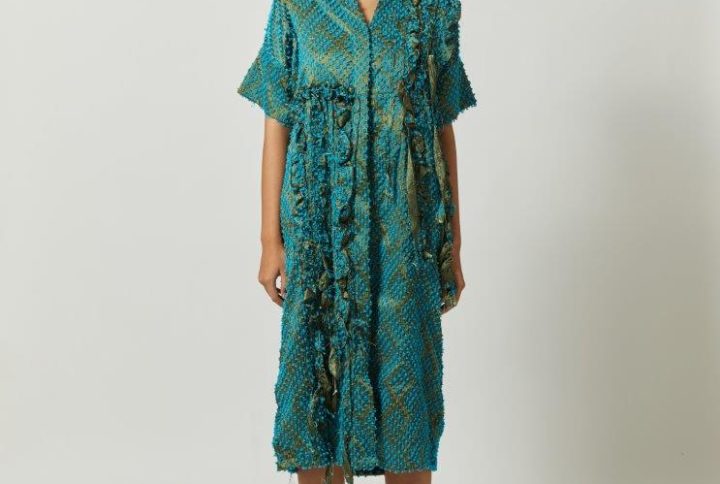 “Mid dress with high neckline, 7/8 sleeves and button openings. Each piece is a masterpiece, skillfully made by Indonesian artisans with generations of expertise, using Jepara’s tenun baron.